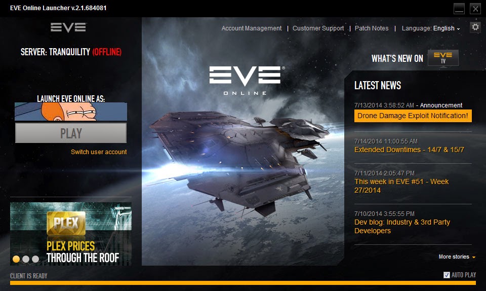 Verkauf durch CCP. Jede CCP PLEX Spezial-Verkaufs-Aktion motiviert die Leute PLEX von CCP zu erwerben. Hat CCP das in letzter Zeit häufig getan? Ich kann mich nicht erinnern in letzter Zeit irgendwelche Werbung für PLEX gesehen zu haben. Oh, Moment .. was ist das da im Launcher – Mist, ein Link um PLEX zu kaufen.