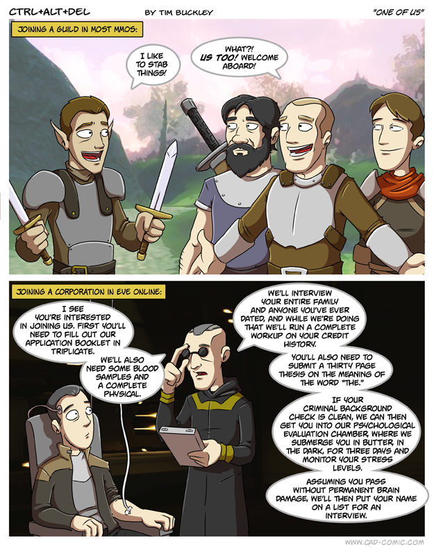 In EVE steckt viel Freiheit, ein Spieler kann mit entsprechend langem Atem innerhalb der Spielregeln Monate an Blut und Schweiß zunichte machen und die Erträge dem Gegner zuführen. Diese Freiheit kontern Spieler als evolutionäres Prinzip mit Weitsicht, Regeln und Integration der Neuen. Genau hier bekommt der Recruitment Comic oben einen tieferen Sinn. Eventuell kann man ursprünglich als Spione gedachte Infiltratoren sogar bekehren – ich meine, wer berichtet schon über die sicher auch vorkommenden missglückten Spionageversuche, weil der Spion sich plötzlich doch wohlfühlte und seinen ursprünglichen Plan aufgab?
